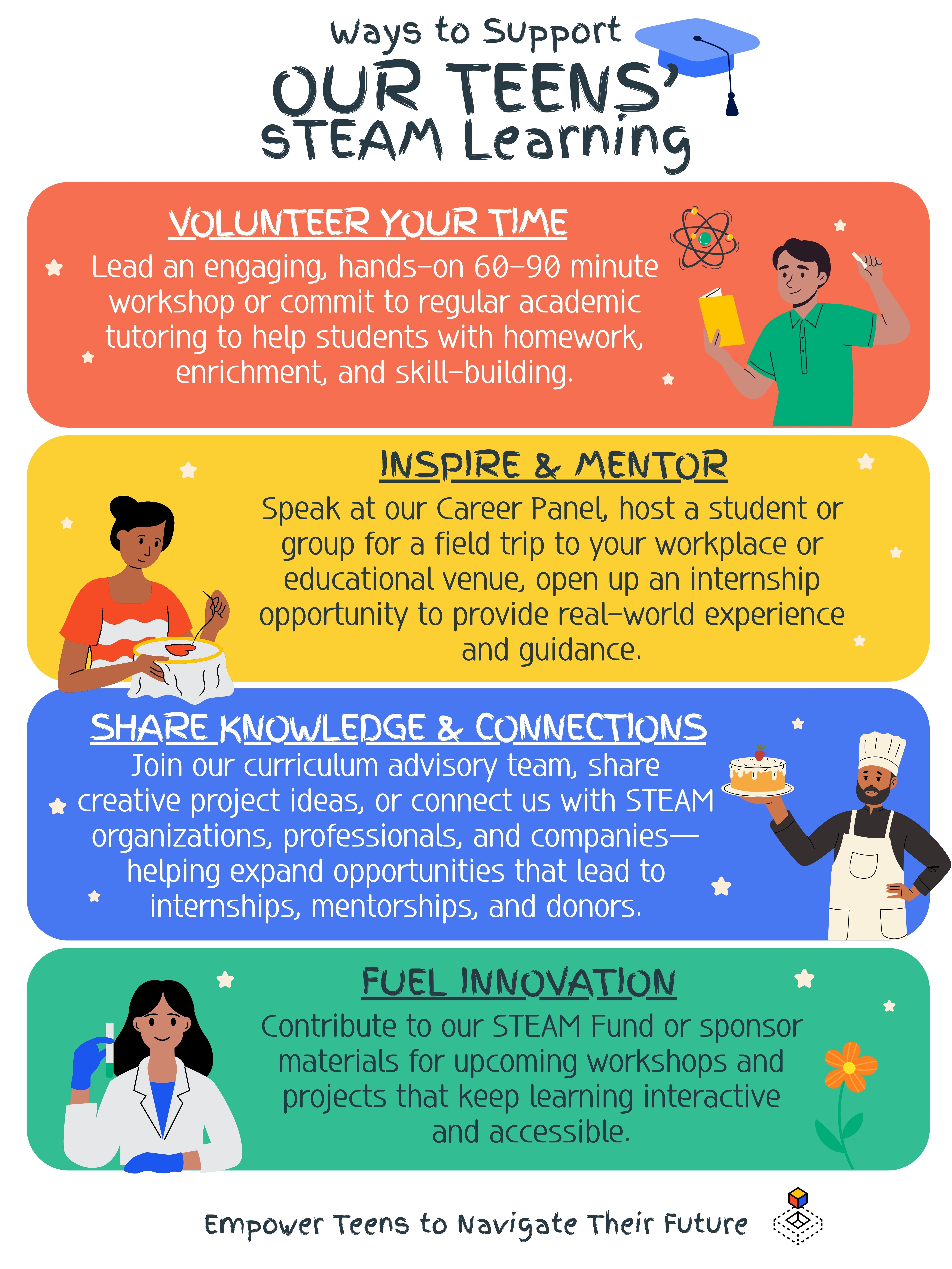 for students to find vocational and development support, mentorship, and resources they otherwise may have limited access to. Our teen programs and services are available at no cost.