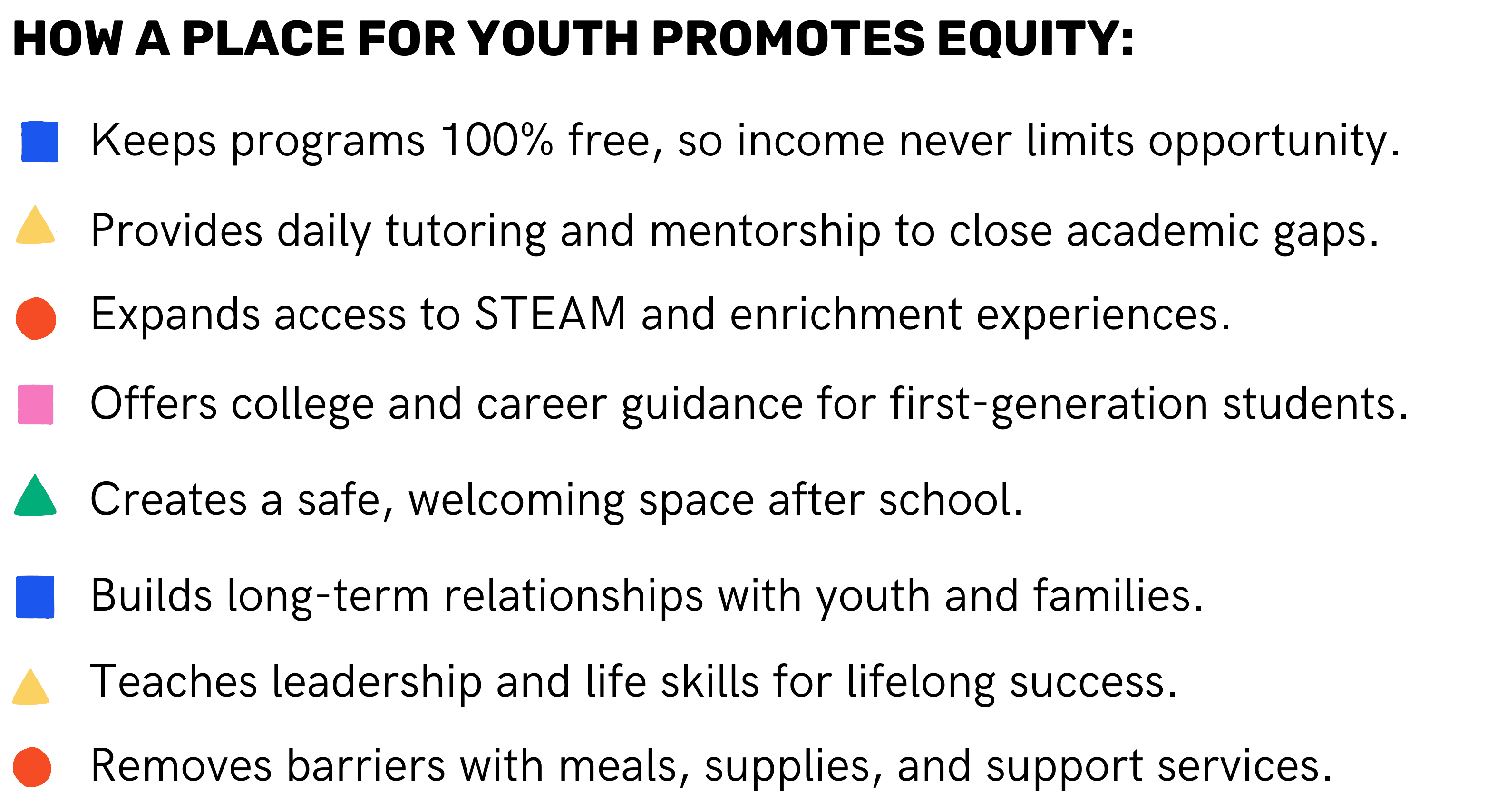 We provide a safe, modern, and welcoming space for youth (13-17) to gather after school, explore their interests, receive mentorship and academic support, and build community.